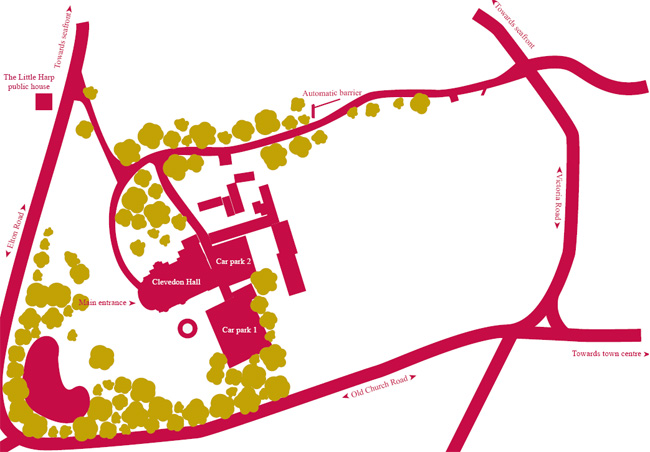 Follow the drive around to the left, and then take the next right signed Clevedon Hall and Car Park. Park in either car park 1 or 2. The entrance will be into the side conservatory, visable from car park 1.